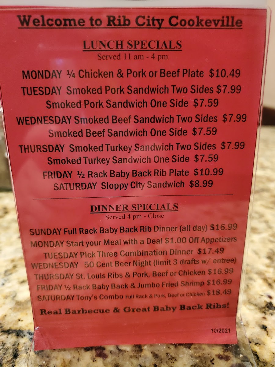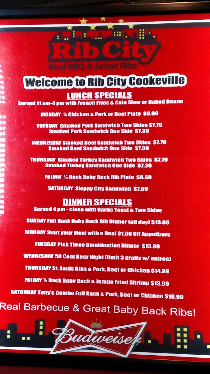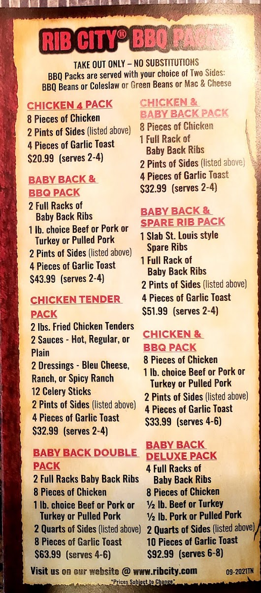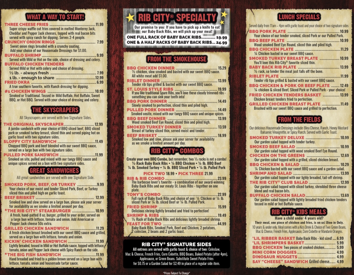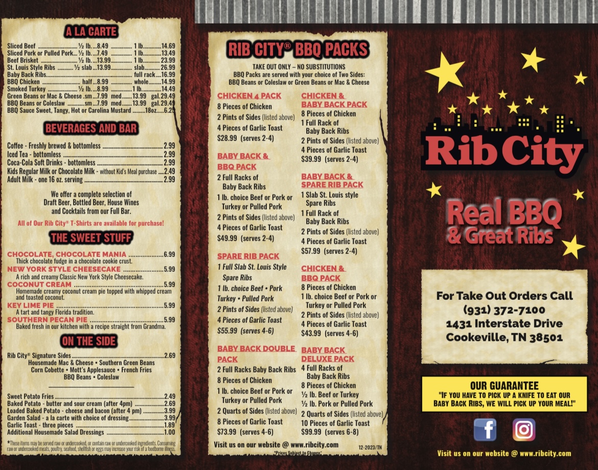Looking for a place where you can indulge in mouthwatering barbecue and feel right at home? The Rib City - Cookeville Menu is your go-to spot! Located at 1431 Interstate Dr in Cookeville, TN, this local gem serves up some of the best ribs, smoked meats, and comfort food in the area. Whether you're craving fall-off-the-bone baby back ribs or a hearty plate of pulled pork, Rib City has something for every barbecue lover.